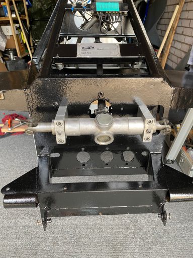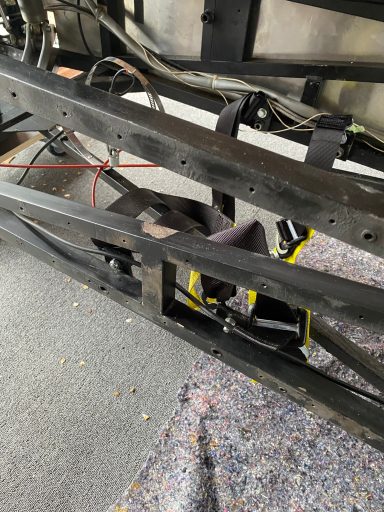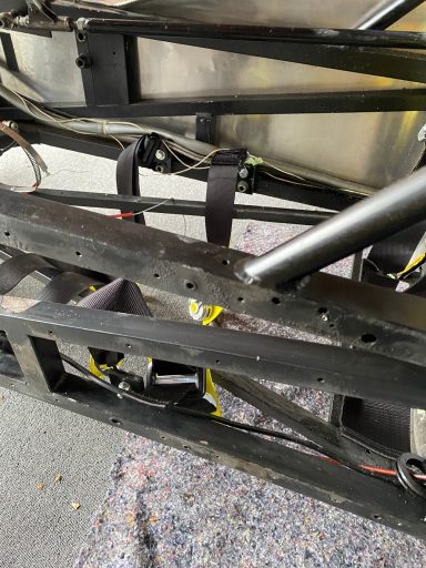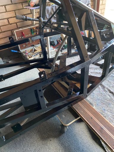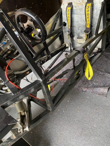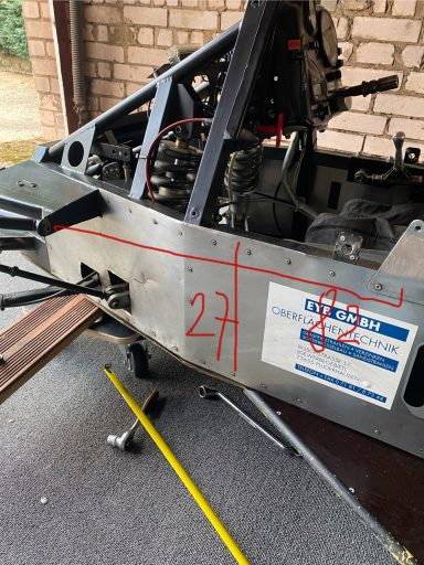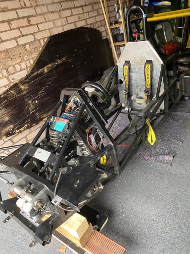 Das Chassis des Formel König befand sich zunächst in einem stark verschmutzten, unbehandelten Zustand. Die Aluminiumbeplankung war teilweise oxidiert, die Struktur zeigte Staub, Öl- und Schmutzablagerungen aus den vergangenen Jahren. Nach vollständiger Demontage und Reinigung wurde der Rahmen sorgfältig entfettet, angeschliffen und anschließend neu lackiert. Der frische, tiefschwarze Lack verleiht dem Gitterrohrrahmen wieder den originalen Werkscharakter und schützt gleichzeitig dauerhaft vor Korrosion.